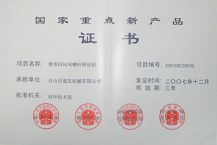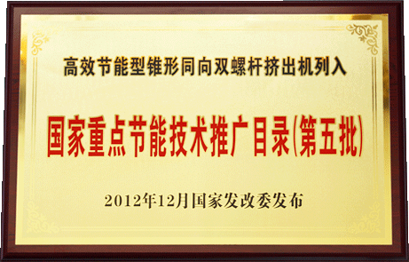 我公司自主研發(fā)的“錐形同向雙螺桿擠出機(jī)”被列入國家重點(diǎn)新產(chǎn)品計(jì)劃,并獲“浙江省名牌產(chǎn)品”稱號(hào)。該產(chǎn)品07年通過省級(jí)產(chǎn)品鑒定:具有高混煉、低剪切、高擠出壓力、低擠出溫度、塑化性能好等特點(diǎn)。相比國內(nèi)同規(guī)格的“錐形異向雙螺桿擠出機(jī)”和“平行同向雙螺桿擠出機(jī)”,產(chǎn)量約高一倍,比功率(電耗)降低30-50%,節(jié)能效果顯著,主要性能參數(shù)達(dá)到國際先進(jìn)水平,產(chǎn)品填補(bǔ)了國內(nèi)空白。